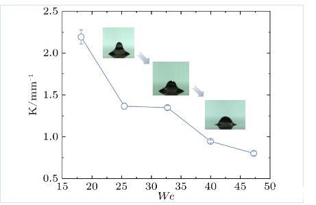 為了更加清晰地表明液滴撞擊的We對三種模態的影響,根據實驗結果總結了撞擊We與電毛細力Cae的關系,如圖7所示。函數結果表明,第一模態可以發生在所有韋伯數內,并且隨著韋伯數的增加,第一模態的閾值電場也在不斷增加。第二模態的閾值電場范圍是三種模態中最小的,韋伯數越大時需要更強的電場才能產生第二模態。第三模態的閾值電場隨著韋伯數的增加也在不斷增大,只是液滴出現第三模態的電場范圍在減小。這可能是由于韋伯數的變化導致拉伸液滴形態的變化,從而影響了靜電力的強度。基于上述考慮,為了深入剖析三種模態閾值電場變化的原因,根據實驗結果對無外加電場條件下液滴拉伸過程中韋伯數We與平均頂點曲率K(如式7所示)的關系進行了討論,如圖8所示。從關系圖中可以看出,當液滴處于回縮階段并達到最大拉伸高度時,韋伯數的增加會伴隨著液滴頂部曲率半徑的增大,而曲率半徑的增大將會導致靜電力的相對減弱。