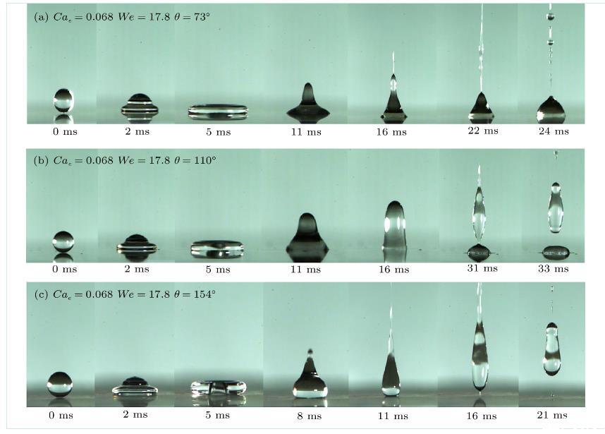 液滴撞擊不同潤濕性壁面后會產生不同的動態行為,通常采用接觸角反映壁面潤濕性。接觸角越小,表面的潤濕性越好,越親水;接觸角越大,表面的潤濕性越差,越疏水。為了觀察潤濕性對電場作用下液滴撞擊表面的影響,除了研究前文的親水表面,還研究了疏水和超疏水表面。圖9為去離子水液滴在電毛細數Cae=0.068(E=6.5 kV/cm)下分別撞擊親水、疏水以及超疏水表面的過程圖。特別注意的是,在本實驗中,液滴撞擊疏水表面并未出現回彈現象。通過比較液滴撞擊三個不同接觸角壁面的實驗結果圖可以發現,當液滴處于第三模態即噴射狀態時,如圖9(a)16 ms所示,液滴在親水表面上底部呈現錐形并且噴射液柱細長,然而,噴射前液滴在疏水表面上呈現圓頭子彈形(圖9b-16ms),噴射后殘留在表面上的液滴量明顯比親水表面減少,如圖9(b)中33 ms所示。液滴在超疏水表面上噴射模態與前兩者更不同,如圖9(c)所示。液滴在撞擊后頂部呈噴射狀態,這是由于靜電力所致,同時液滴在不斷地脫離表面,這是由于超疏水表面的特殊結構使得液滴無法在表面附著,與無電場時液滴撞擊超疏水表面不同的是,在液滴反彈過程中底部會產生絲狀液柱,如圖9(c)-16 ms所示。