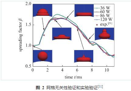 為了定量分析網(wǎng)格數(shù)量對數(shù)值模擬結(jié)果準(zhǔn)確性的影響,以液滴撞擊壁面時(shí)的鋪展因子作為定量分析指標(biāo)及網(wǎng)格無關(guān)性驗(yàn)證的評判標(biāo)準(zhǔn)。網(wǎng)格數(shù)量從36 w開始增加,每次增長大約30 w,并繪制液滴鋪展因子β隨時(shí)間變化與網(wǎng)格數(shù)量的關(guān)系圖。如圖2所示,網(wǎng)格數(shù)在86 w以上時(shí)基本不會(huì)對模擬結(jié)果產(chǎn)生影響,為保證模擬精度并確保求解時(shí)間,本文采用86 w網(wǎng)格數(shù)作為模型的基準(zhǔn)網(wǎng)格數(shù)進(jìn)行模擬。從圖中也可以看出,數(shù)值模擬結(jié)果與參考文獻(xiàn)中的實(shí)驗(yàn)結(jié)果趨于一致,說明本文采用的模型可以用于研究液滴撞擊球面的Leidenfrost現(xiàn)象。