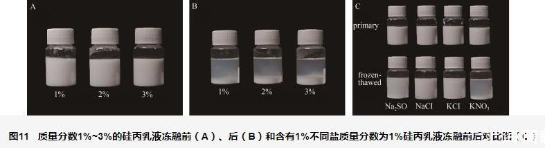 圖11質(zhì)量分數(shù)1%~3%的硅丙乳液凍融前(A)、后(B)和含有1%不同鹽質(zhì)量分數(shù)為1%硅丙乳液凍融前后對比圖(C)