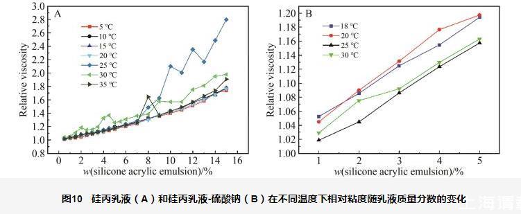 圖10硅丙乳液(A)和硅丙乳液-硫酸鈉(B)在不同溫度下相對粘度隨乳液質(zhì)量分數(shù)的變化