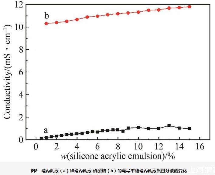 圖8硅丙乳液(a)和硅丙乳液-硫酸鈉(b)的電導(dǎo)率隨硅丙乳液質(zhì)量分數(shù)的變化