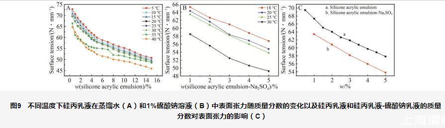 圖9不同溫度下硅丙乳液在蒸餾水(A)和1%硫酸鈉溶液(B)中表面張力隨質(zhì)量分數(shù)的變化以及硅丙乳液和硅丙乳液-硫酸鈉乳液的質(zhì)量分數(shù)對表面張力的影響(C)