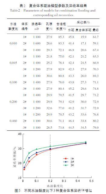 為驗證上述判斷,同時確定上述界限值,補充了水油黏度比分別為0.010,0.100和0.200條件下的驅油實驗,模型參數及采收率結果匯總如表2和圖5所示。