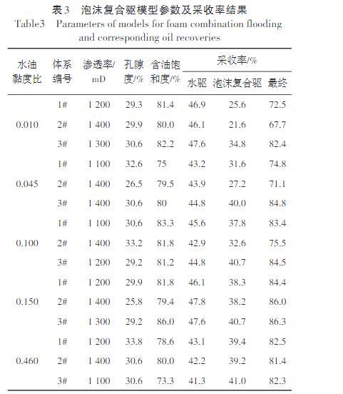 隨著水油黏度比的增大,3種泡沫復合體系采收率增幅的差異逐漸減小,水油黏度比界限為0.150:①當水油黏度比小于該界限,分別為0.010,0.045和0.100時,1#超低界面張力泡沫復合體系驅油采收率增幅分別為25.6%,31.6%和37.8%;2#乳化泡沫復合體系驅油采收率增幅分別為21.6%,27.2%和32.6%,較1#采收率增幅低,1#超低界面張力泡沫復合體系驅油效果強于2#乳化泡沫復合體系,后者不能替代前者;3#雙效泡沫復合體系驅油采收率增幅分別為34.8%,40.0%和40.7%,較1#高9.2%,8.4%,2.9%;可見,在超低界面張力基礎上增強體系乳化性能,能夠明顯改善驅油效果。