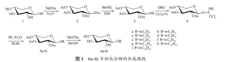 采用全乙酰化的木糖(2)在四氯化錫催化下與一系列脂肪醇發(fā)生偶聯(lián)反應(yīng),對(duì)時(shí)間要嚴(yán)格控制,否則有部分轉(zhuǎn)化成α-異構(gòu)體,當(dāng)時(shí)間過長時(shí),還會(huì)形成以α-糖苷為主的產(chǎn)物和少量2-位脫保護(hù)的糖苷副產(chǎn)物。參考烷基-β-D-葡萄糖苷等合成與性能研究成果,按照Scheme1所示的路線,以D-木糖(1)為原料通過乙酰化、脫1-位乙酰基、與三氯乙腈反應(yīng),得到相應(yīng)的三氯乙酰亞胺酯(4)。采用易于構(gòu)筑1,2-反式糖苷鍵的三氯乙酰亞胺酯法,以三氟化硼乙醚作糖苷化偶聯(lián)反應(yīng)的催化劑,使得具有鄰基參與效應(yīng)的三氯乙酰亞胺酯(4)與相應(yīng)的脂肪醇反應(yīng)及相應(yīng)的脫乙酰基保護(hù),合成一系列烷基-β-D-吡喃木糖苷,如圖1所示。本文作者對(duì)其溶解性、表面張力、乳化性能、液晶性能、熱穩(wěn)定性等理化性質(zhì)進(jìn)行研究。