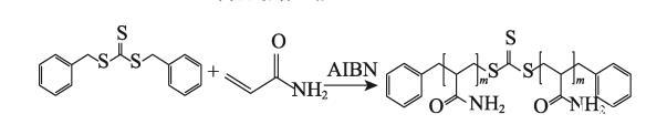 在500 mL四口燒瓶中加入200 g無(wú)水乙醇、10 g(0.14 mol)AM和一定量DBTTC〔其中,n(AM)∶n(DBTTC)=100∶1、200∶1、300∶1、500∶1、700∶1、1000∶1〕,超聲混合均勻后再加入0.0231 g(0.14 mmol)AIBN,然后在70℃下反應(yīng)8 h。反應(yīng)結(jié)束后,趁熱出料,過(guò)濾。在超聲條件下,用正己烷洗滌沉淀,過(guò)濾,重復(fù)數(shù)次,除去未反應(yīng)完全的反應(yīng)物,在45℃下真空干燥24 h,得到淡黃色的PAM-CTA固體粉末。將上述不同n(AM)∶n(DBTTC)制得的產(chǎn)物依次命名為PAM-CTA-1、PAM-CTA-2、PAM-CTA-3、PAM-CTA-4、PAM-CTA-5、PAM-CTA-6。