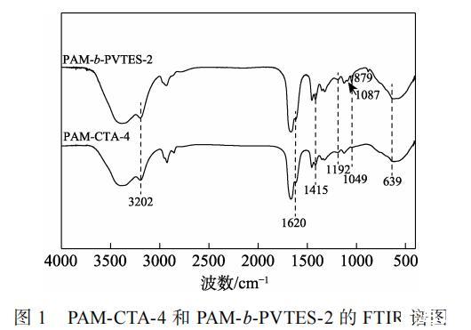 圖1為聚合物的FTIR譜圖。由圖1可知,對(duì)于PAM-CTA-4,3202 cm–1處為—NH2的伸縮振動(dòng)吸收峰,1620 cm–1處為C==O鍵的伸縮振動(dòng)吸收峰,1192 cm–1處的吸收峰為C—S鍵的伸縮振動(dòng),1049 cm–1處的吸收峰為C==S鍵的伸縮振動(dòng),1415 cm–1處的吸收峰歸屬于苯環(huán)骨架的伸縮振動(dòng),639 cm–1處的吸收峰為苯環(huán)上單取代的特征峰,表明聚合物PAM-CTA-4已經(jīng)成功制備。在PAM-b-PVTES-2的FTIR譜圖中,879 cm–1處為Si—C鍵的伸縮振動(dòng)吸收峰,1087 cm–1處為Si—O鍵的伸縮振動(dòng)吸收峰,表明聚合物已成功制備。