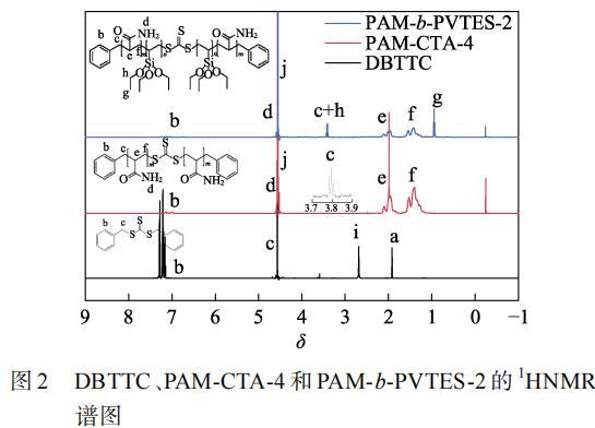 圖2為DBTTC、PAM-CTA-4和PAM-b-PVTES-2的1HNMR譜圖。如圖2所示,DBTTC的1HNMR譜圖曲線中δ=1.92(a)為氘代丙酮的質(zhì)子峰,δ=7.13~7.31(b)是苯環(huán)上的質(zhì)子峰;δ=4.56(c)的峰為亞甲基(—CH2—)的質(zhì)子峰;δ=2.62(i)為DBTTC樣品中含有的極少量H2O的質(zhì)子峰,可以確定成功合成了RAFT試劑DBTTC。PAM-CTA-4和PAM-b-PVTES-2的1HNMR譜圖曲線中,δ=4.80(j)為重水(D2O)的質(zhì)子峰;δ=7.27~7.48(b)是苯環(huán)上的質(zhì)子峰;δ=4.82(d)為酰胺基(—NH2)的質(zhì)子峰;δ=1.95~2.24(e)是主鏈上的次甲基(—CH—)的質(zhì)子峰;δ=1.31~1.66(f)是主鏈上的亞甲基(—CH2—)的質(zhì)子峰。在PAM-CTA-4曲線中,δ=3.78~3.82(c)為與苯環(huán)相連亞甲基的質(zhì)子峰。PAM-b-PVTES-2曲線中δ=3.39~3.43(c+h)為與苯環(huán)相連和乙烯基中的亞甲基(—CH2—)質(zhì)子峰;δ=0.93~0.95(g)為有機(jī)硅中甲基(—CH3)的質(zhì)子峰。通過(guò)FTIR譜圖和1HNMR譜圖可以確定合成了PAM-CTA-4和PAM-b-PVTES-2。