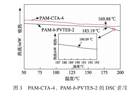 圖3為PAM-CTA-4、PAM-b-PVTES-2的DSC曲線。從圖3可以看出,PAM-CTA-4只有一個(gè)玻璃化轉(zhuǎn)變溫度(Tg),為169.88℃,但是PAM-b-PVTES-2有兩個(gè)Tg,分別為183.19和190.09℃,分別對(duì)應(yīng)了聚丙烯酰胺(PAM)和聚乙烯基三乙氧基硅烷(PVTES)的Tg。PAM和PVTES鏈段間存在一定的相互作用,這些相互作用導(dǎo)致嵌段共聚物中兩相的Tg與各自均聚物的Tg不同,兩相的相互作用(融合)導(dǎo)致Tg向兩者之間移動(dòng)。由此可知,合成的聚合物具有兩相結(jié)構(gòu),屬于嵌段共聚物。