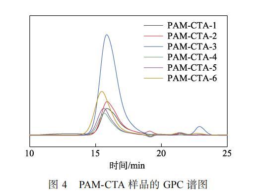 從表1可知,隨著DBTTC用量的降低,共聚物相對(duì)分子質(zhì)量逐漸增加,重均相對(duì)分子質(zhì)量(Mw)由5755增加到10505。這是因?yàn)椋S著鏈轉(zhuǎn)移劑DBTTC用量的增加,反應(yīng)體系中DBTTC的濃度增加,鏈增長自由基與鏈轉(zhuǎn)移劑DBTTC反應(yīng)生成休眠中間體,鏈增長停止,PAM-CTA的相對(duì)分子質(zhì)量隨著鏈轉(zhuǎn)移劑用量的增加而降低,實(shí)現(xiàn)對(duì)PAM-CTA相對(duì)分子質(zhì)量的可控合成。由于PAM-CTA-4的分子量分布最窄,因此,選擇PAM-CTA-4進(jìn)行下一步反應(yīng)。