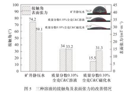 ①試劑及其濃度可降低溶液的表面張力,改善溶液的濕潤性。通過測試6種濃度的十二烷基硫酸鈉(SDS)、十二烷基苯磺酸鈉(SDBS)、十二烷基磺酸鈉和塵克C&C礦用除塵劑溶液,發現質量分數0.10%的塵克C&C溶液其表面張力最小且環境友好,相較于礦井靜壓水,可使表面張力下降43.83%(至33.2 mN/m)。