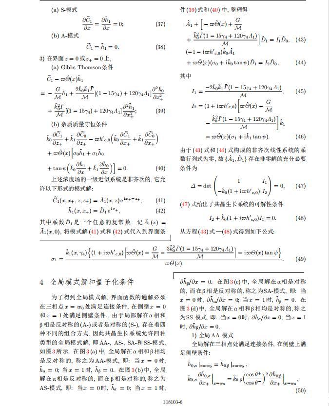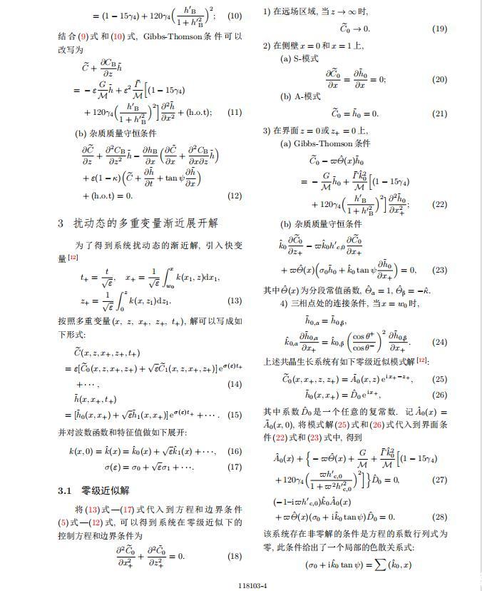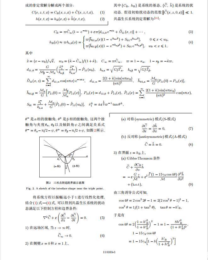 為考察共晶生長形態穩定性,利用共晶生長的定常解作為基態進行穩定性分析.在初始時刻t=0時對基態解做一小擾動,并將在t>0以后形成的非定常解分解成兩個部分: