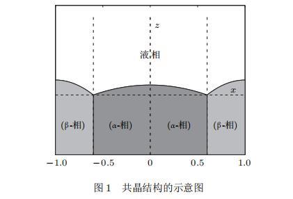 假設由α和β兩相組成的片層共晶以拉度V向液相穩定推進,共晶片層與固-液界面垂直.選取固-液界面處α相片層的中心為坐標原點,x軸與片層垂直,z軸與晶體生長方向平行,如圖1所示.共晶界面用函數z=h(x,t)表示,它也是共晶生長解的一部分.