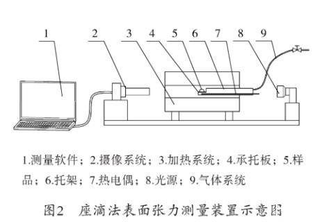 座滴法表面張力測量裝置結構如圖2所示,由測量軟件、攝像系統、加熱系統、承托板、樣品、托架、熱電偶、光源、氣體系統構成。
