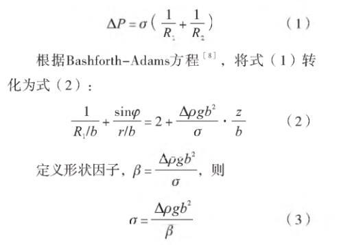 座滴法是基于熔體(液體)在水平托板表面形成穩定橢球液滴的形狀參數測量表面張力的方法[6]。基于座滴法測量玻璃熔體表面張力,玻璃熔體在水平托板上受重力和表面張力共同作用形成旋轉軸對稱橢球[7](圖1),橢球表面任一點的壓力差與表面張力之間的數學關系見式(1):