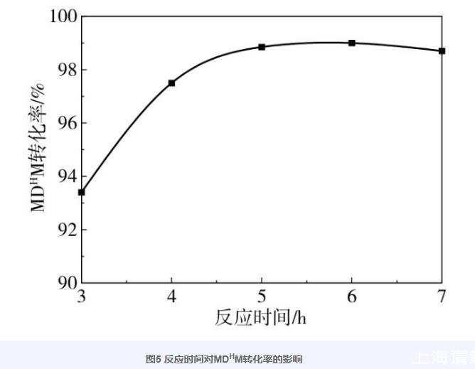 在n(BEO)∶n(MDHM)為1.05∶1、三氯化釕催化劑的用量為30 mg/kg、反應溫度100℃的條件下,考察反應時間對MDHM轉化率的影響,結果如圖5所示。由圖5可知,隨著反應時間的增加,MDHM轉化率逐漸增大,當反應時間為6.0 h時轉化率最大,繼續增加反應時間MDHM轉化率沒有提高,并且增加了生產成本及能源消耗。因此,本文確定適宜的反應時間為6.0 h。