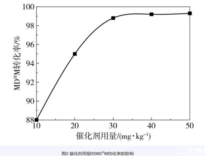 在n(BEO)∶n(MDHM)=1.05∶1、反應時間6.0 h、反應溫度100℃的條件下,考察三氯化釕催化劑用量對MDHM轉化率的影響,結果如圖2所示。可以看出,隨著催化劑用量的增加,MDHM轉化率逐漸增大。當催化劑用量大于30 mg/kg時,MDHM轉化率可達99%以上。與催化劑用量30 mg/kg相比,催化劑用量為40 mg/kg時MDHM轉化率僅提高了0.25%,提升幅度不大,同時催化劑用量增加使得生產成本提高,產物顏色加深。綜合考慮,本文確定適宜的催化劑用量為30 mg/kg。