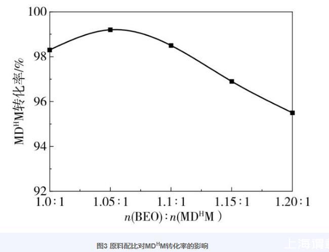 在n(BEO)∶n(MDHM)為1.05∶1、三氯化釕催化劑的用量為30 mg/kg、反應時間6.0 h的條件下,考察反應溫度對MDHM轉化率的影響,結果如圖4所示。可以看出,MDHM轉化率隨溫度的升高而增大,這主要是因為Si—H鍵的反應活度受溫度影響,溫度越高越有利于其斷裂。溫度為100℃的MDHM轉化率(99.05%)相較90℃的MDHM轉化率(98.6%)僅提高了0.45%,提升幅度很小,這是因為反應溫度過高會使催化劑的催化效率降低,產物顏色加深,但考慮到MDHM轉化率須大于等于99%,因此本文確定適宜的反應溫度為100℃。