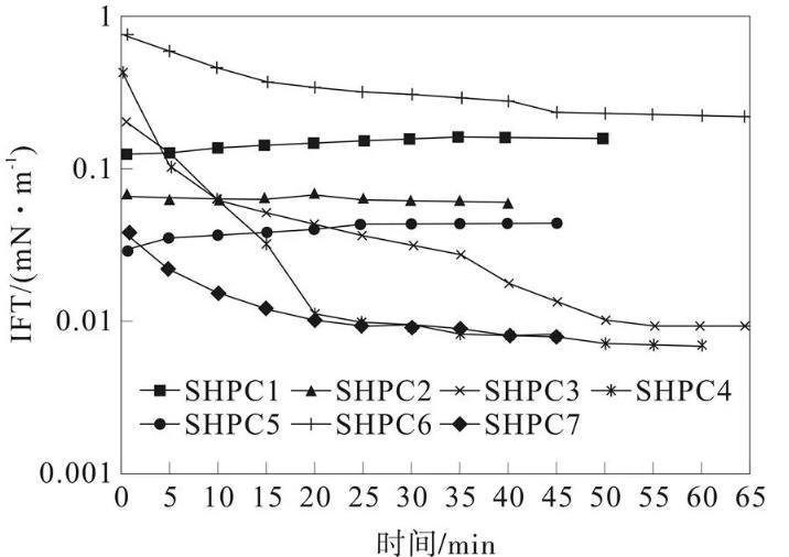 將SHPC1~7活性體系溶液配制為濃度大小為0.25%的溶液,密閉24 h,然后利用Texas-500C界面張力儀對界面張力進(jìn)行動態(tài)測定,從而得到圖2所示的結(jié)果。