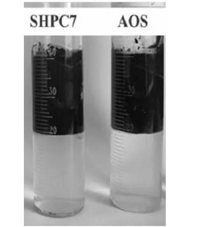 為驗(yàn)證SHPC7活性劑與其他表面活性劑的性能,通過乳化實(shí)驗(yàn)對SHPC7活性劑與AOS活性劑在乳化方面的乳化性能進(jìn)行觀察,從而可以得到如圖3的實(shí)驗(yàn)前后效果。