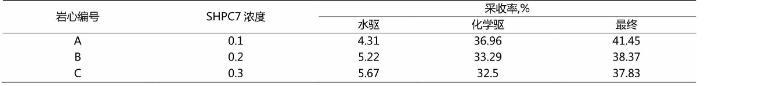 由此,通過表2看出,在增大SHPC7表明活性劑的濃度下,其驅(qū)油效果在不斷增加。但是在0.3%的濃度下其驅(qū)油采收率小于濃度為0.2%的采收率。根據(jù)上述的結(jié)果得出,在實(shí)際的應(yīng)用中,應(yīng)選擇SHPC7表明活性劑濃度大小為0.2%的濃度,此時采收率最高。