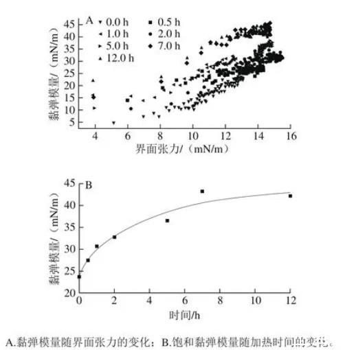 如圖4A所示,隨著蛋白不斷吸附到油-水界面上(界面張力的增加),樣品的黏彈模量也不斷增加,說明不同纖維化階段的產(chǎn)物在油/水界面存在明顯相互作用,使得界面層具有較強(qiáng)的黏彈性。同時(shí)隨著纖維化轉(zhuǎn)變的進(jìn)行(加熱時(shí)間的延長(zhǎng)),其界面黏彈模量逐漸升高,說明纖維化轉(zhuǎn)變有利于界面吸附層的黏彈性的提高。如圖4B所示,隨著纖維化轉(zhuǎn)變的進(jìn)行,其飽和模量不斷升高,但在不同階段,其變化幅度不同。即在纖維化的初始階段上升較快,而后期則上升不明顯,這表示纖維化轉(zhuǎn)變的完成,體系中纖維的數(shù)量增加不再明顯,體系的界面黏彈模量的變化趨于平緩。蛋白質(zhì)納米纖維屬于形狀各向異性材料,其在油/水界面上的相互作用不同于一般的球形顆?;蛉嵝愿叻肿?,具有更強(qiáng)的相互作用,因而能產(chǎn)生更高的界面黏彈性。食品油/水界面或氣/水界面的穩(wěn)定依賴于界面膜的強(qiáng)度,即黏彈模量。目前食品行業(yè)大多數(shù)采用的吐溫、蔗糖酯等小分子表面活性劑所形成的界面膜通常較弱,在食品儲(chǔ)藏過程中容易使界面失穩(wěn),從而導(dǎo)致食品結(jié)構(gòu)的破壞(如奶油的乳析、植脂末的滲油等)。蛋白質(zhì)纖維聚集體所表現(xiàn)出的高界面強(qiáng)度則有助于上述問題的解決。