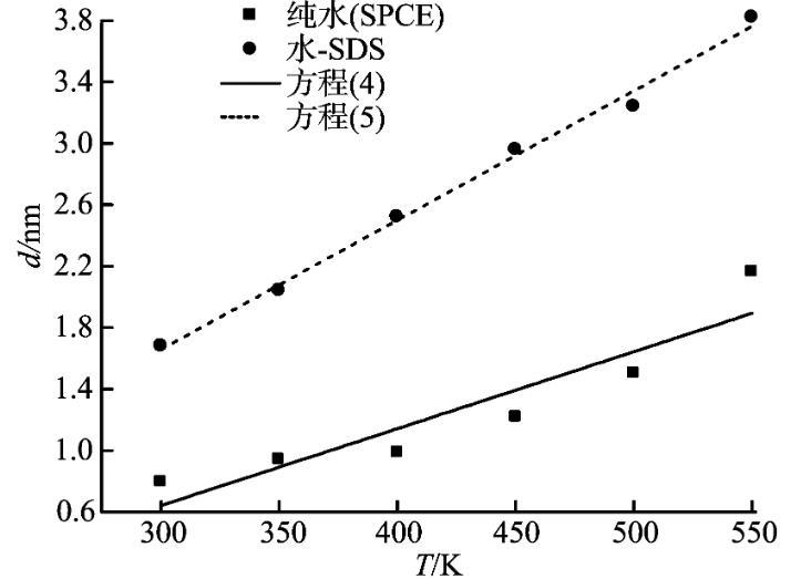 界面厚度取從水相體相密度的90%到表面活性劑體相密度的90%。模擬水分子數N1=3 000,十二烷基硫酸鈉數N2=20,在溫度T=300、350、400、450、500和550 K時,模擬得到界面厚度,將其與純水體系的界面厚度對比,如圖9所示。從圖9可以看出,水—表面活性劑體系的界面厚度隨溫度的增加而增加,而且和純水體系的界面厚度對比可知,水—表面活性劑體系的氣—液界面厚度明顯增大。同時,對純水體系和水—表面活性劑體系的界面厚度模擬值進行擬合可分別得到式(4)和(5)。