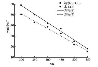 從圖11可以看出,水—表面活性劑體系的界面張力隨溫度的升高而降低,而且加入十二烷基硫酸鈉后水的界面張力明顯降低。對純水體系和水—表面活性劑體系的界面張力模擬值進行擬合可分別得到式(6)和(7)。