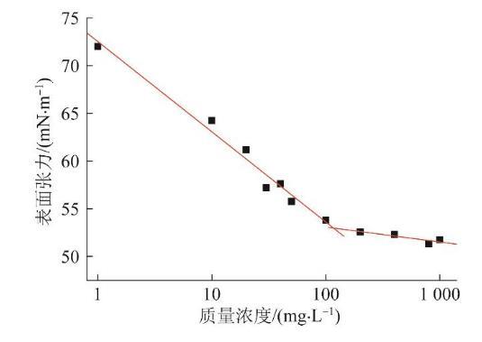 采用掛片法測量不同濃度h-PAMAM水溶液的表面張力(鉑片尺寸19.9 mm×10 mm×0.2 mm;精度0.01 mN/m)。不同濃度的h-PAMAM水溶液在室溫下的表面張力如圖2所示,由凝膠滲透色譜法(GPC)測得h-PAMAM的平均分子質量為8 351 g/mol,并通過其計算了相關的熱力學參數。