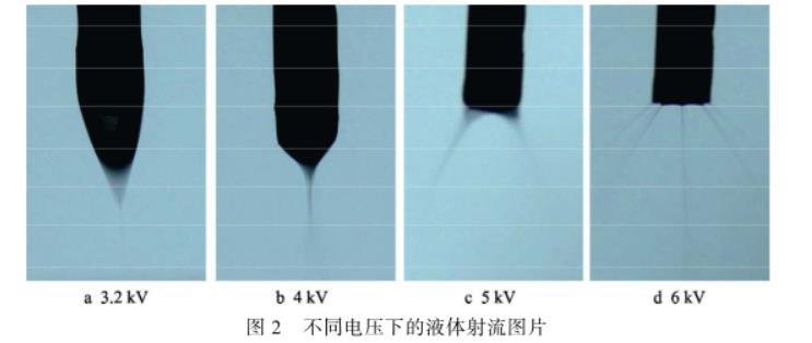 電壓越高,液體霧化成的液滴越細小。隨著電壓的升高,液滴霧化的射流狀態(tài)大致可以分為三種:滴狀模式、錐射流模式和多股射流模式。在較小的電壓(0~3 kV)下,噴嘴處液體所受的電場力小于表面張力,噴嘴中液體以滴狀形態(tài)落下,為滴狀模式。電場力逐漸增大,噴嘴液體被拉成細長軸狀,形成連續(xù)的射流。進一步增大電壓(如圖2a、b所示),液體在噴嘴處形成錐狀,且破碎成小霧滴,為錐射流模式,如圖2b所示,射流狀態(tài)最穩(wěn)定。