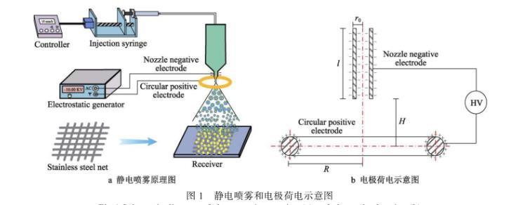 靜電噴霧裝置主要由高壓靜電發(fā)生器、控制器、微量注射器、噴嘴電極、環(huán)形電極和接收板組成,如圖1a所示。噴嘴電極連接高壓靜電發(fā)生器的負極,環(huán)形電極接高壓靜電發(fā)生器的正極。高壓靜電發(fā)生器輸出負高壓,在噴嘴電極會產生大量的負電荷,同時環(huán)形電極上會感應出正電荷。調節(jié)靜電發(fā)生器的參數(shù),控制噴嘴電極和環(huán)形電極之間的電場強度。將微量注射泵固定在支架上,使用微量注射泵將溶液勻速泵送到噴嘴處。液體從噴嘴噴出時與高壓電極接觸,使電極上的電荷傳導到液體。帶電液體在靜電力、電荷互斥力、重力、環(huán)境復合力的作用下,破碎成細小液滴,并均勻地吸附在工件上。