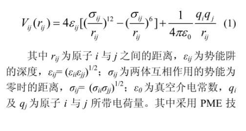 在計(jì)算過(guò)程中,綜合考慮了系統(tǒng)內(nèi)分子間非鍵結(jié)作用力(范德華力、庫(kù)倫靜電力)及分子內(nèi)鍵結(jié)作用力(鍵拉伸和鍵彎曲)。分別采用Lennard-Jones勢(shì)能函數(shù)模擬范德華力,庫(kù)侖定律模擬庫(kù)侖靜電力,具體分子間勢(shì)能函數(shù)如式(1)所示