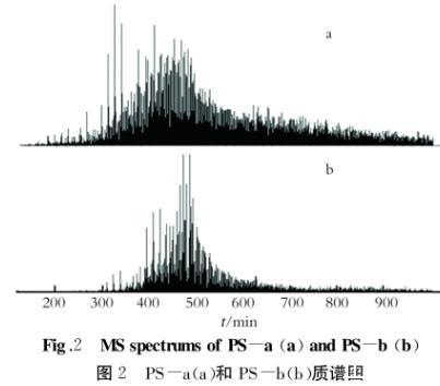 在確定的質譜分析條件下,樣品PS-a和PS-b的質譜圖如圖2所示。