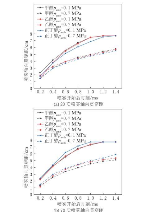 在試驗中發(fā)現(xiàn),高溫高壓的環(huán)境對噴霧形態(tài)產(chǎn)生了較大的改變,相比于單種工況,環(huán)境溫度和背壓共同對噴霧形態(tài)有著更復雜的影響。圖8為3種醇類燃料在不同溫度(20℃、70℃、120℃)、不同背壓(0.1 MPa、0.7 MPa)的環(huán)境下,噴射壓力為20 MPa時的噴霧軸向貫穿距的變化。
