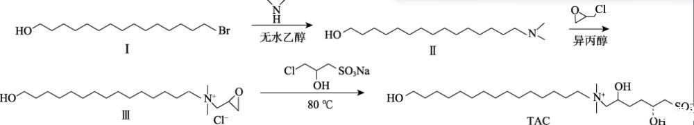 本文擬以15-溴-1-十五醇、二甲胺水溶液、環(huán)氧氯丙烷、3-氯-2-羥基丙磺酸鈉為原料,通過季銨化反應(yīng)和開環(huán)反應(yīng)制備了甜菜堿表面活性劑(TAC)。通過聚合物和表面活性劑分子的疏水單元組成的混合膠束與聚合物主鏈發(fā)生物理交聯(lián),從而產(chǎn)生擴(kuò)展的聚合物網(wǎng)絡(luò),以期改善稠化酸的耐溫、耐剪切性能,提高180℃高溫地層的油氣采收率。