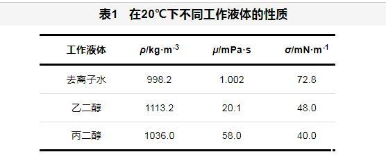 表1在20℃下不同工作液體的性質(zhì)
