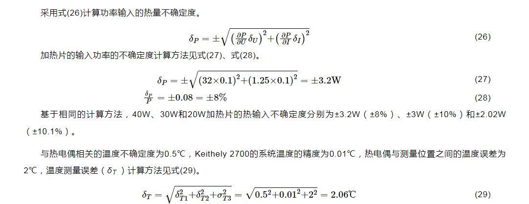 基于相同的計(jì)算方法,40W、30W和20W加熱片的熱輸入不確定度分別為±3.2W(±8%)、±3W(±10%)和±2.02W(±10.1%)。