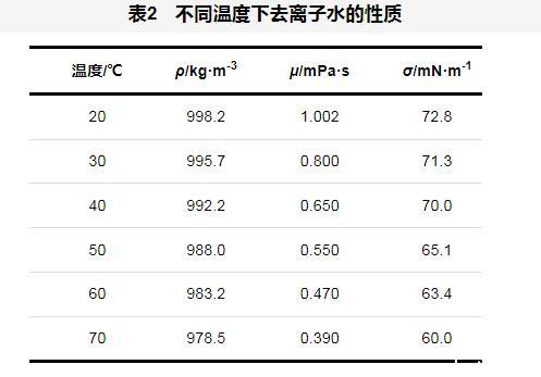 能夠在壁面上完全鋪展的液膜不僅僅與壁面的結(jié)構(gòu)和潤濕性有關(guān),還與液體本身的物性有著密切關(guān)系。較高的黏度會(huì)導(dǎo)致液膜在流動(dòng)過程中變得更加穩(wěn)定且不容易破裂,使得液膜的分布相對(duì)均勻;表面張力會(huì)改變壁面上液膜的潤濕性,從而影響液膜在壁面上的鋪展能力。因此,深入探討不同物性對(duì)液膜分布的影響,具有重要的理論意義和實(shí)際應(yīng)用價(jià)值。在實(shí)驗(yàn)中工作液體包括去離子水、乙二醇、丙二醇。工作液體的性質(zhì),如表1所示。同時(shí)溫度的變化將直接影響液體的黏度和表面張力,隨著溫度的升高液體分子的動(dòng)能也隨之增強(qiáng),分子間的相互作用減弱,黏度和表面張力都將減小,進(jìn)而影響液膜的形成和鋪展,不同溫度下去離子水的性質(zhì),如表2所示。