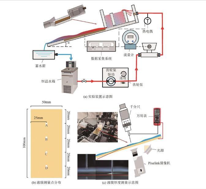 本實(shí)驗(yàn)的實(shí)驗(yàn)裝置,如圖3(a)所示。該裝置主要由液體回路、布液器和實(shí)驗(yàn)段三大部分組成。液體回路用于提供不同的流動(dòng)條件,以確保布液器能夠穩(wěn)定形成液膜。在這個(gè)回路中,液體從恒溫水箱(Julabo-Vivo RT2)中流出,恒溫水箱提供一個(gè)穩(wěn)定的入口溫度,由齒輪泵(Cole-parmer)控制液體流量大小,液體再流入流量計(jì)(Micro motion 2700,精度為±0.05%),流量計(jì)監(jiān)測(cè)管道內(nèi)液體的質(zhì)量流量,在布液器的入口端放置一個(gè)T型熱電偶(精度為±0.5℃)來測(cè)量入口溫度的變化,最后使用數(shù)據(jù)采集器(Keithely 2700)采集流量計(jì)的質(zhì)量流量、熱電偶的溫度和加熱片的功率。本實(shí)驗(yàn)對(duì)入口溫度要求較高,所以采用一些保溫措施,在不銹鋼管和布液器腔室周圍包裹一層保溫棉,減少熱量損失。