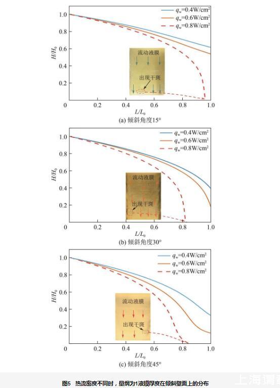 圖5所示的數(shù)學(xué)模型中,壁面傾斜角度分別為15°、30°和45°,噴淋密度為0.016kg/(m·s)、0.03kg/(m·s)和0.04kg/(m·s),入口溫度為70℃。通過施加不同的熱流密度加熱壁面,模型計(jì)算得出了量綱為1液膜厚度在傾斜壁面上的分布情況。結(jié)果顯示,當(dāng)熱流密度qw=0.8W/cm2時(shí),不同傾斜角度下的壁面上量綱為1液膜厚度均逐漸減小,最終降至零,出現(xiàn)了燒干現(xiàn)象。同時(shí),模型計(jì)算結(jié)果與實(shí)驗(yàn)結(jié)果相符,干斑位置均出現(xiàn)在壁面底部,這一現(xiàn)象的產(chǎn)生不僅是由于蒸發(fā)的作用,還與熱毛細(xì)效應(yīng)密切相關(guān)。在加熱過程中,熱毛細(xì)效應(yīng)促進(jìn)了液膜表面張力的變化,使得液膜的穩(wěn)定性減弱,導(dǎo)致液膜局部破裂。隨著蒸發(fā)效應(yīng)的增強(qiáng),液膜厚度逐漸減小,特別是在液膜的薄弱區(qū)域,蒸發(fā)速率提高,導(dǎo)致液膜厚度進(jìn)一步減小,最終在底部區(qū)域發(fā)生破裂。因此,干斑通常出現(xiàn)在壁面底部,這進(jìn)一步驗(yàn)證了實(shí)驗(yàn)結(jié)果與數(shù)學(xué)模型計(jì)算之間的良好一致性,并表明所建立的數(shù)學(xué)模型能夠有效預(yù)測(cè)液膜在傾斜加熱壁面上的流動(dòng)行為和燒干現(xiàn)象。