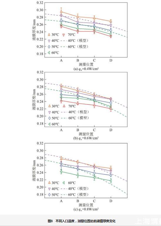 如圖8所示,模型計算的初始值存在差異,這是因為溫度升高時,液體黏度減小,導致初始值下降。此外,隨著熱流密度的增大,模型計算值會顯著降低。模型計算值與實驗結果之間表現出較好的吻合性,進一步表明該模型在預測液膜厚度變化方面具有較高的可靠性。從整體來看,液膜厚度隨著加熱壁面長度方向L的增加以及入口溫度的升高而逐漸減小。這一現象源于液膜在加熱壁面上流動過程中,表面發生蒸發。隨著壁面長度方向距離的增加,液膜的蒸發時間延長,導致液膜逐漸變薄。液膜蒸發過程主要受到蒸發和熱毛細耦合作用影響,液膜與加熱壁面之間的溫差是驅動熱毛細效應的關鍵,而表面蒸發速率則與蒸氣壓差密切相關。在此過程中,液膜的表面溫度逐漸升高,形成了一個溫度梯度,從而加劇了蒸發效應。此外,入口溫度對去離子水物性有顯著影響,特別是對黏度的變化尤為關鍵。隨著溫度升高,液體的黏度降低,導致液膜流動性增強,使得液膜更易于薄化。這種變化使液膜在加熱壁面上的蒸發時間縮短,并且更容易接近飽和蒸汽狀態,顯著提升了蒸發速率。隨著蒸發速率的增加,液膜厚度進一步減小,同時液膜表面溫度逐步逼近臨界蒸發溫度,推動了表面層的快速蒸發。更為重要的是,入口溫度的提升還使得液膜表面更加接近飽和蒸汽狀態,造成了較大的蒸氣壓差。這種壓差進一步促進了蒸發速率的增加,從而加劇了膜厚度的減薄趨勢。這一現象表明,熱流密度和入口溫度等因素通過影響熱毛細效應和蒸發速率,共同作用于液膜的演化。
