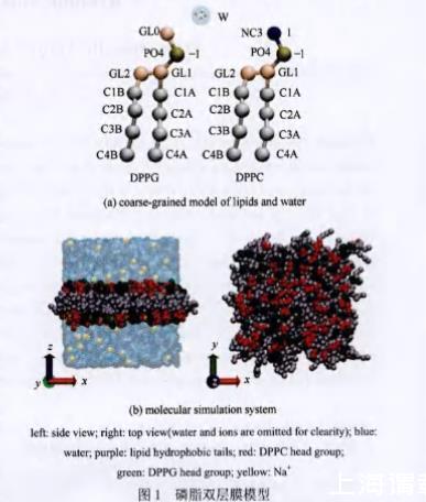 所有的模擬體系[圖1(b)]中,整個盒子有216個磷脂分子,兩個磷脂單層的磷脂分子的數目及比例均一致。對于由DPPC構成的磷脂膜,在模擬體系中加入9028個溶劑粒子。對于由DPPC和DPPG構成的磷脂膜,為了保證模擬體系電中性,與DPPG數目相等的溶劑粒子被替換為鈉離子(Na+)。