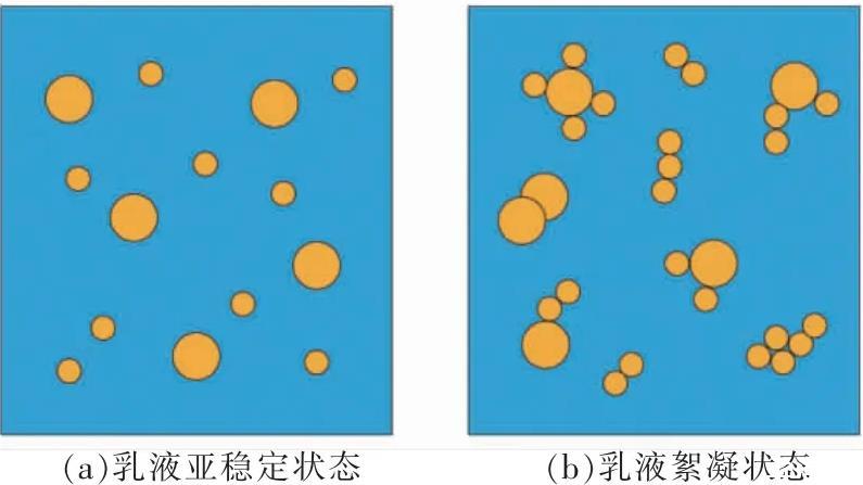 通常情況下,乳化劑會在高速剪切等方式的強機械作用力下與油相和水相充分接觸,進而有序的排列在油-水界面層,形成彈性界面膜;界面膜會通過降低油-水界面張力來保護乳液液滴結構,使其在一段時間內不會因正常外界條件的變化而出現擴張破裂等現象,最終達到穩定乳液的目的。大多數乳液會在添加表面活性劑、固體顆粒等幾天、幾個月甚至幾年內表現出穩定狀態。然而,由于兩相之間界面張力的存在,使得乳液成為一種熱力學不穩定的亞穩態系統,具體表現為水、油兩相會隨著時間的延長逐漸分離,主要的不穩定性機制包括重力分離、絮凝、聚結和Ostwald熟化。其中,重力分離是指在乳液儲存過程中,由于密度差異,油相會逐步聚集到油-水界面導致界面膜加厚,致使乳液分層;聚結作用體現為乳液中兩個或多個小液滴相互吸引,從而組成一個更大液滴;Ostwald熟化則是指小的乳化液滴開始消失,大的乳化液滴不斷擴大的現象。絮凝作為單腔室乳液最微妙、最復雜的失穩機制,是指乳液液滴之間的相互排斥能力小于相互吸引能力,大部分分散液滴以小團或大團(絮)的形式近距離存在的一種狀態,如圖2所示。