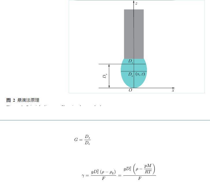 筆者采用懸滴法進(jìn)行水與瓦斯之間表面張力的測(cè)試,當(dāng)水滴被靜止懸掛在毛細(xì)管的管口處時(shí),液滴的外形主要取決于重力和表面張力的平衡,通過對(duì)水滴外形的測(cè)定獲得水與瓦斯之間表面張力計(jì)算的相關(guān)參數(shù)。懸滴法原理圖如圖2所示,采用自開發(fā)的水與瓦斯之間界面張力分析軟件獲得式(1)中Ds、De,聯(lián)合水、瓦斯的密度、修正后的形狀因子(F)、重力加速度(g),基于式(2)計(jì)算水與瓦斯之間的表面張力。