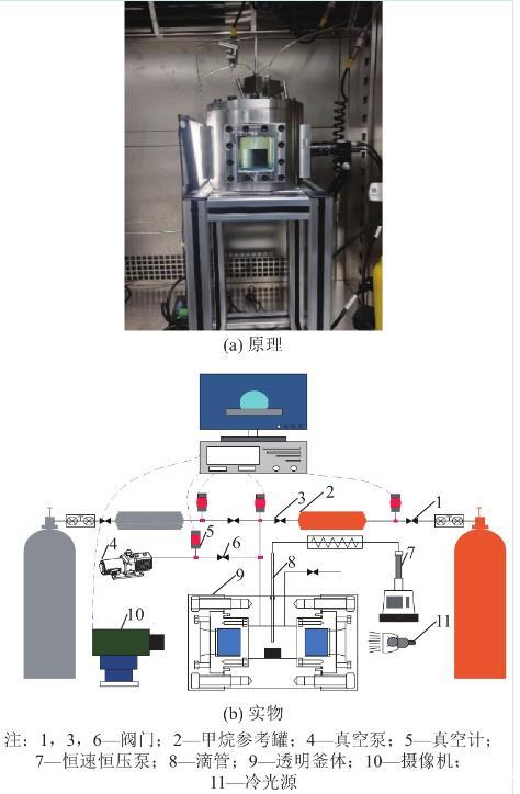 含瓦斯煤與水之間接觸角測(cè)試設(shè)備具備抽真空、充氣吸附、恒溫控制、滴水、光學(xué)成像及自動(dòng)采集數(shù)據(jù)的功能,設(shè)備的實(shí)物圖及原理分別如圖1a—圖1b所示。