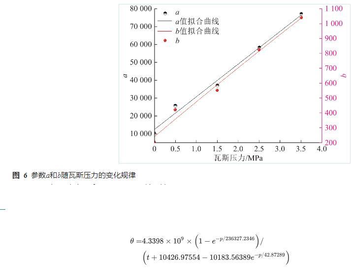 由圖5可知,同一瓦斯壓力下,接觸角隨著時間的增加而逐漸減小,說明水分在含瓦斯煤表面發生了浸潤現象。接觸角θ與時間t滿足的關系,參數a和b的值如圖6所示。參數a與壓力p滿足的關系,參數b與壓力p滿足的關系。接觸角與壓力及時間的關系如式(4)所示。