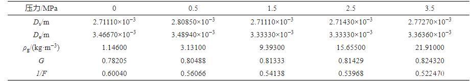 采用團隊自開發的水與瓦斯之間的表面張力分析軟件對不同瓦斯壓力條件下的水滴形貌(圖3)進行分析,即可獲得式(1)中的Ds及De。F為G修正后的形狀因子,F通過查表及插值法獲得,式(1)中的參數見表1,將表1中的參數帶入式(1)及式(2),即可獲得不同瓦斯壓力條件下水與瓦斯之間的表面張力(圖4)。