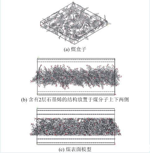 采用Materials studio分子動力學軟件中的Amorphous Cell功能,建立一個由150個wender無煙煤分子組成的煤盒子(圖10a),煤盒子的長和寬均為10 nm;然后創建一個與煤盒子等長/等寬的含有2層石墨烯的結構,通過Build layers功能將含有2層石墨烯的結構放置于煤分子上下兩側(圖10b);最后,通過不斷的壓縮、移動及結構優化操作,將上下兩側的石墨烯結構刪除,獲得平整的煤表面模型(圖10c)。