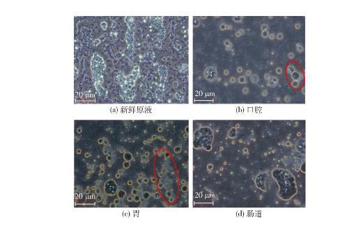 圖7是通過光學顯微鏡拍攝的模擬消化后各階段乳液的形態。圖7(a)顯示,消化前乳液粒徑大小適宜且分布密集,其中高亮處的乳液粒徑較大,此時乳液具有良好的穩定性;圖7(b)顯示,經口腔模擬消化后的乳液分布較為稀疏,但仍存在W1/O/W2雙重乳液結構;觀察圖7(c),經模擬胃消化后的乳液整體粒徑較大且分布相較于圖7(b)密集,同時觀察到中小液滴高密度堆積成帶,說明在強酸和胃蛋白酶存在下,雙重乳液傾向于聚結在一起,這一結果增加了液滴間的聚集率,進而導致乳液粒徑增大;圖7(d)結果顯示,經模擬腸道消化后的乳液失去原有的多相結構,高度聚結后的乳液破裂后釋放出W1/O型液滴,又堆積形成大小、形狀不一的大液滴,部分微粒粒徑增大到5 600 nm,而油相經膽鹽的乳化作用進一步會形成更小的油滴。實驗結果表明,經模擬口腔、胃消化后的乳液仍具有良好的雙重乳液結構,而乳液由于聚集作用,粒徑逐漸增大,最終在模擬腸道消化階段,雙重乳液結構破壞,釋放出的W1/O型乳液在胰酶的作用下分解并釋放出LOPs。